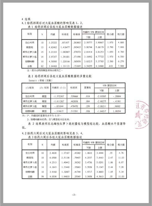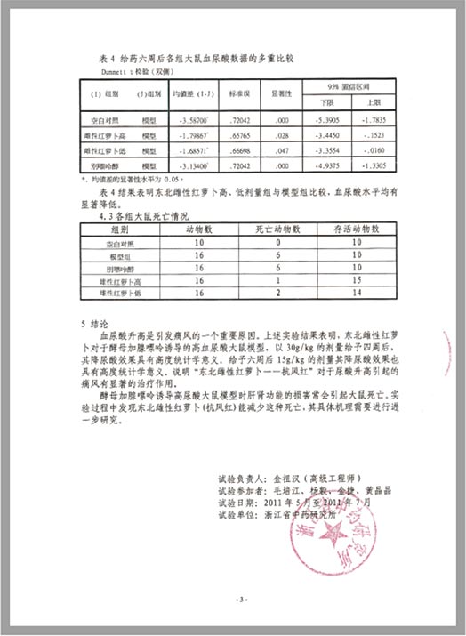 結(jié)論:血尿酸升高是引發(fā)痛風(fēng)的一個(gè)重要原因。實(shí)驗(yàn)結(jié)果表明,東北雌性紅蘿卜對(duì)于酵母加腺嘌呤誘導(dǎo)的高血尿酸大鼠模型,以30g/kg的劑量給予四周后,其降尿酸效果具有高度統(tǒng)計(jì)學(xué)意義。說明“抗風(fēng)紅·東北雌性紅蘿卜”對(duì)于尿酸升高引起的痛風(fēng)具有顯著的作用。