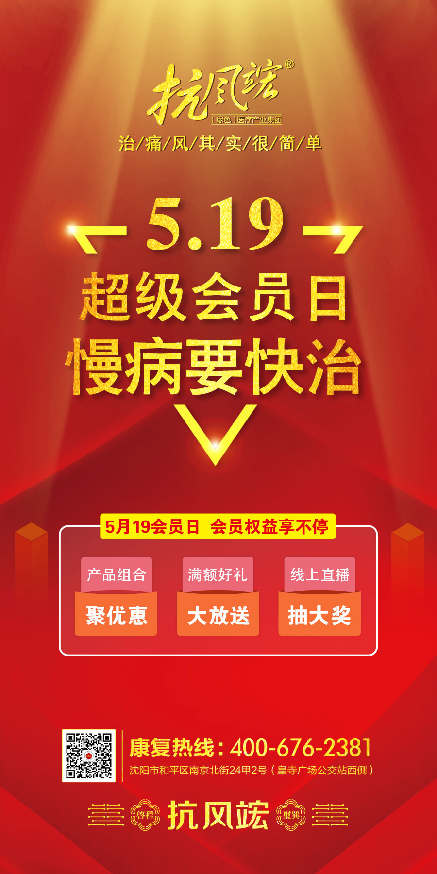 抗風(fēng)竤(綠色)醫(yī)療產(chǎn)業(yè)管理集團(tuán),正式啟動(dòng)“超級(jí)會(huì)員日”為十二年來跟隨抗風(fēng)竤一路走來的9萬余名痛風(fēng)患者以及深受痛風(fēng)困擾的8000萬患者創(chuàng)造了一個(gè)屬于自己的康復(fù)節(jié)日,即每月19日定為抗風(fēng)竤“超級(jí)會(huì)員日”。